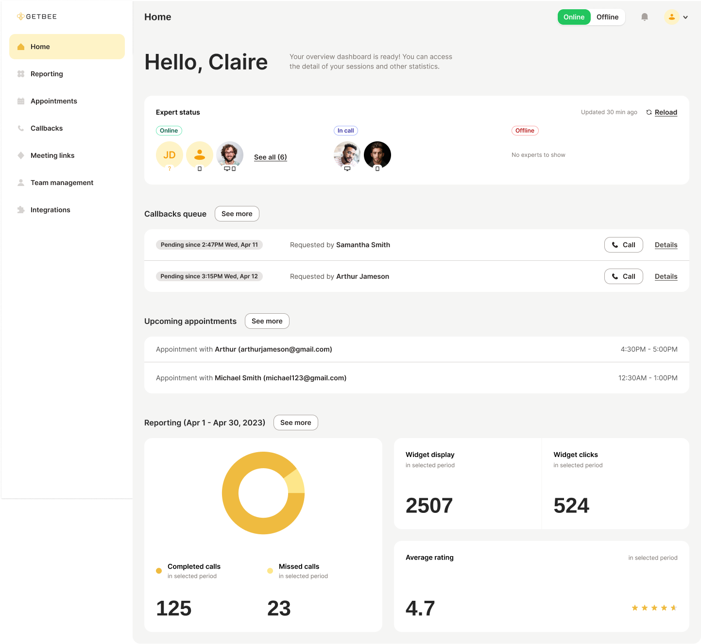 The call is received by a brand expert using the GetBee Expert Dashboard.